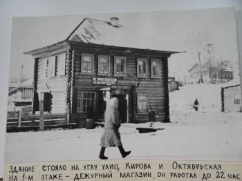 Фото 1957г. здание магазина № 3 (дежурный магазин) на углу улиц Кирова и Октябрьская пос.Верхошижемье