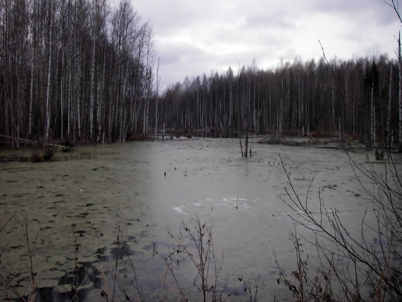 Когда- то планировалось соединить п. Воскресенское, что на Ветлуге, с г. Урень шоссейной дорогой и даже было сделано 5-7км насыпи по ходу просека. По обеим сторонам от насыпи образовались котлованы после выемки грунта, заполненные водой. Их выбрали себе для жилья маленькие симпатичные уточки: чирки. Когда солнце нагрело воздух, с обеих сторон от насыпи послышалось урчание лягушек. Стали попадаться погрызенные лосями молодые осины, а также немалые кучи лосиных экскрементов, а также многочисленные следы пребывания рябчиков. Лес по сторонам просека в основном лиственный с преобладанием осины. Видимо лесовозобновление на месте сплошных рубок не проводилось. По просеку глубокие колеи от тракторов МТЗ, на которых местные "старатели" вывозили рельсы разобранный железной дороги. Определяются и следы от машин, вероятно, Казанских любителей внедорожников. Где-то на середине пути стоит аншлаг, извещающий о том что, здесь охраняемая территория Килемарского заказника. По идее в заказнике должна быть елово- пихтовая южно- русская тайга, а на самом деле осиново- березовое мелколесье. Основание моста через р. Пиштанку сделано из железных двухтавровых балок, а вот настил в основном из полусгнивших в коре березовых нетолстых бревен, по которому и пешком я прошел с некоторым опасением, как бы не провалиться. Нижегородская сотовая связь в районе моста уже не действует. Через некоторое время под ногами захлюпала вода, лес поредел. Впереди я увидел... тополя и скворечник на одном из них и какие то полуразрушенные строения. Это и есть Пиштань . Местность, на которой располагался поселок, довольно низмннная. Среди высоченной бурой прошлогодней травы глубокие канавы и колеи, заполненные водой. С одной из низин сорвались утка и два кряковых селезня, погнавшиеся за ней. Ива вовсю цвела. Набухли почки у многочисленных кустов одичавшей смородины. Я осмотрел два дома. Один из них, видимо, использовался, как кордон Килемарского заказника, Второй, хорошо сохранившийся, судя по разбросанным по полу почтовым открыткам, принадлежал некому Леониду Инютину. Вид полной запущенности и разрухи не располагал к поискам Пиштанского пруда, тем более я читал его описания и видел фотографии в инете, а отсутствие связи вынуждало меня скорее двинуться в обратный путь. Вот и приходишь к выводу, что полной свободы не бывает вообще.