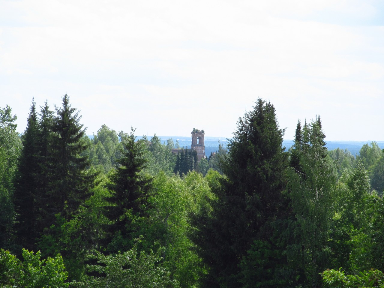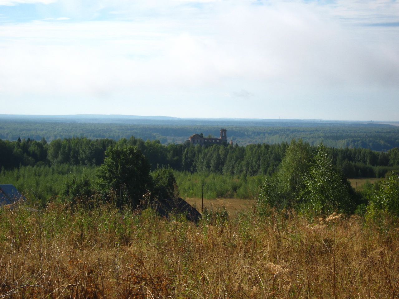 Вид на Подрельскую церковь с поля д. Зоновщины, 70-е годы