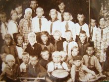 1938 год. Село Соловецкое. Летний пионерский лагерь. В 3-м ряду сверху сидит справа - Перминова Полина - фото из архива Дементьевой Т.Г.