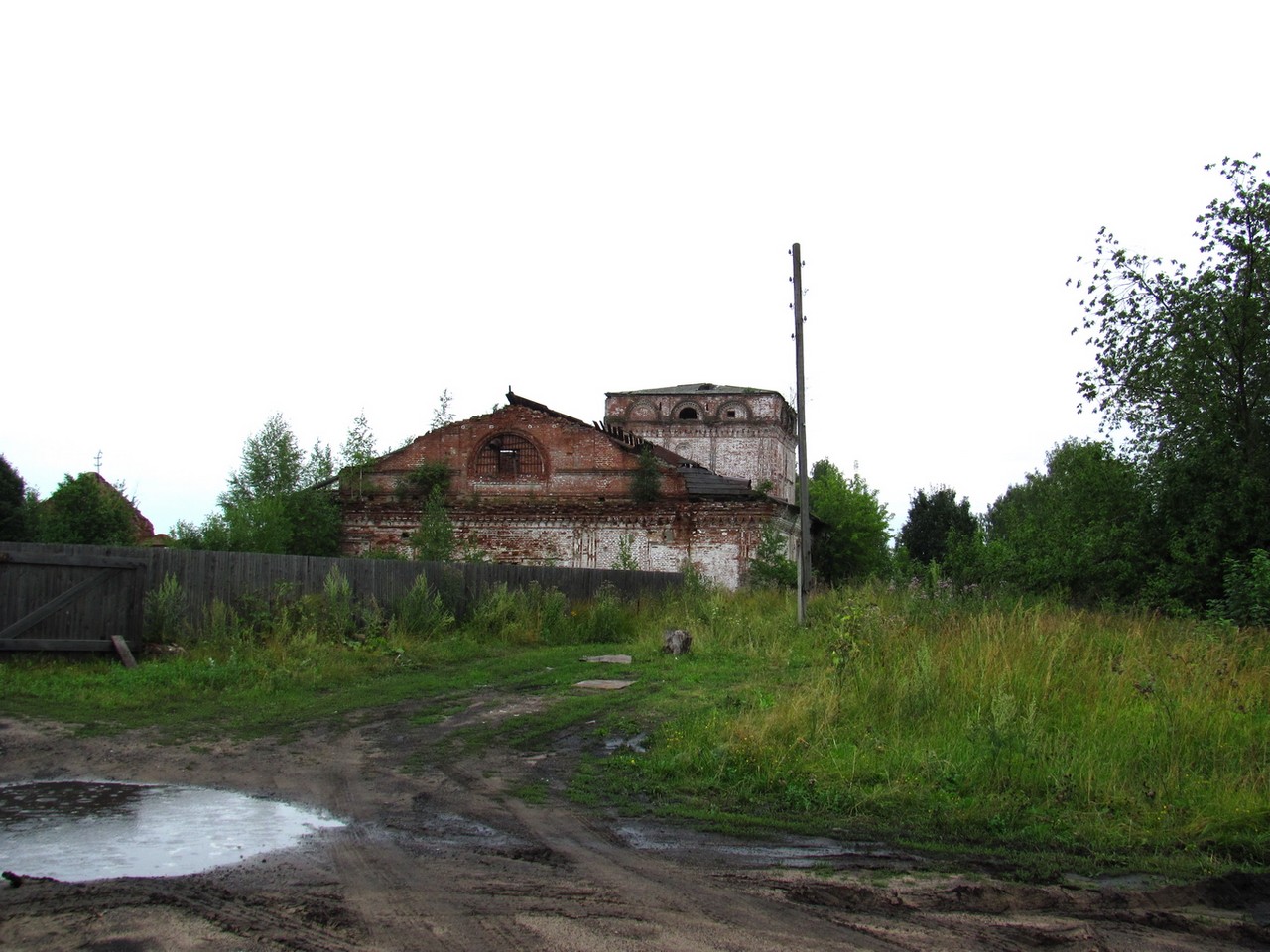 Каменная, построена в 1750-55 г.; теплый храм построен новый в 1865 г. Престолов два: в холодном храме в честь Преображения Господня, в теплом на правой стороне во имя Архистратига Божия Михаила, на левой престол не освящен.