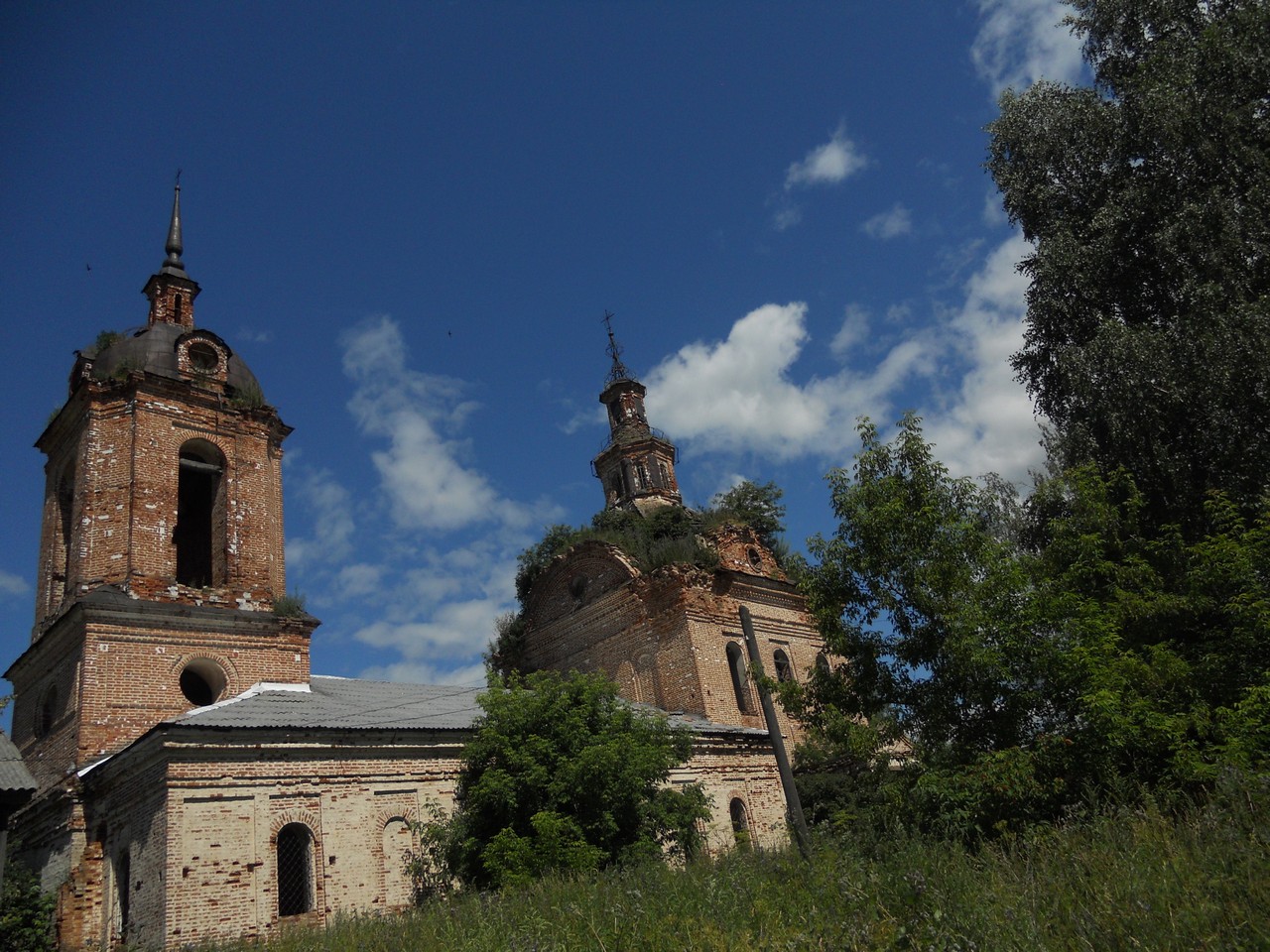 27 ноября 1785 г. Вятской духовной консисторией выдана храмозданная грамота № 2272 на строительство каменной церкви. Церковь была построена в 1795 г. на средства прихожан с тремя престолами: в холодной церкви – главный – во имя Св. Троицы, в теплой церкви – правый в честь Апостола Андрея Первозванного и левый – в честь Св. Стефана Великопермского. Престолы в теплой церкви освящены 29–31 мая 1800 г., холодный храм освящен 3 июня 1802 г.