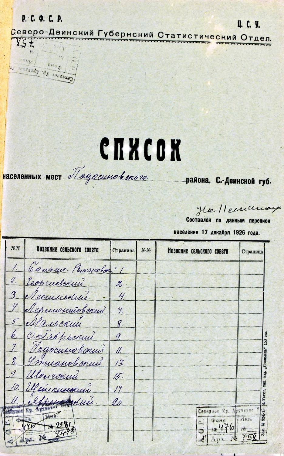 Источник: Список населенных мест Подосиновского района С.-Двинской губ. по данным переписи населения 17 декабря 1926 года // МКАУ ВУЦА. Ф. 476. Оп. 1. Д. 487.